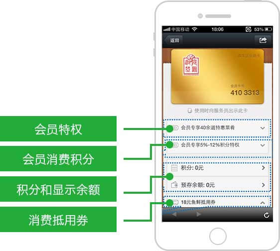 顧客在微信服務(wù)號(hào)免費(fèi)開通會(huì)員卡,無需制作管理實(shí)體卡,零成本增加新會(huì)員。