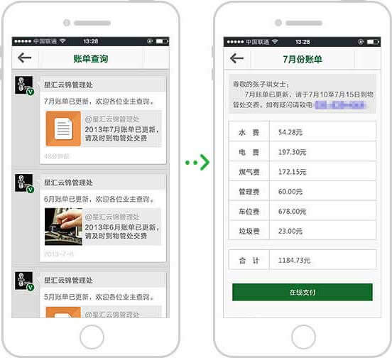 用戶可通過微信公眾賬號隨時收到小區(qū)物業(yè)信息,方便用戶隨時了解社區(qū)動態(tài),告別公告欄