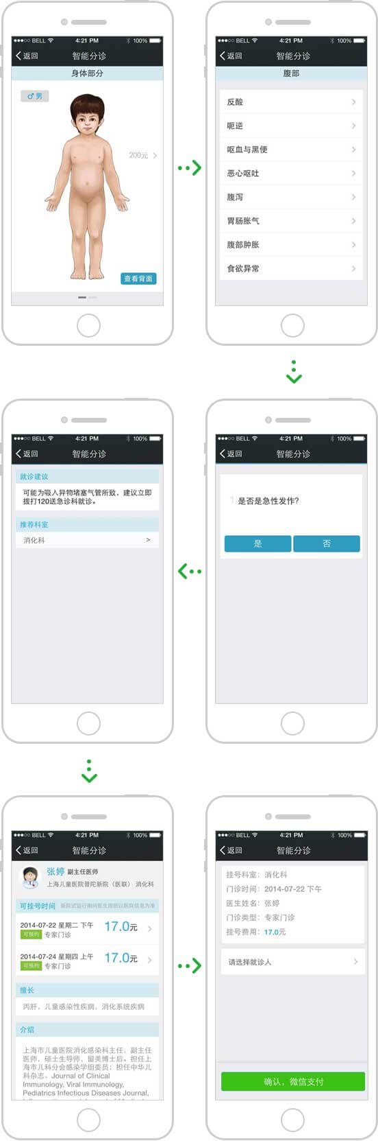 智能選擇病患部位,智能問診,確定看診科室;提供掛號科室建議,選擇科室(專家)、時段,支付掛號費用,完成掛號