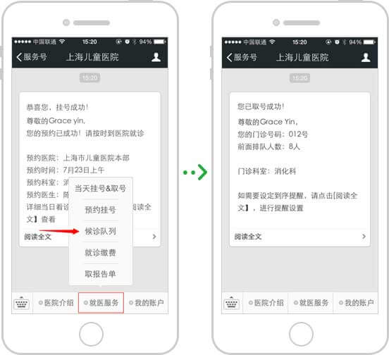 看診當(dāng)天提醒掛號時間及看診注意事項,公眾號內(nèi)查詢當(dāng)前診室前排隊情況