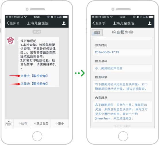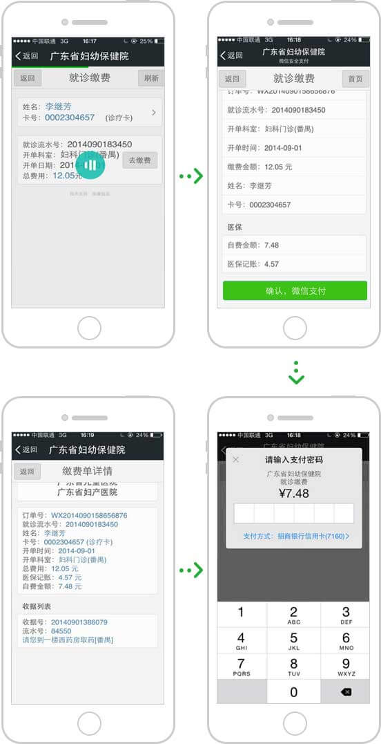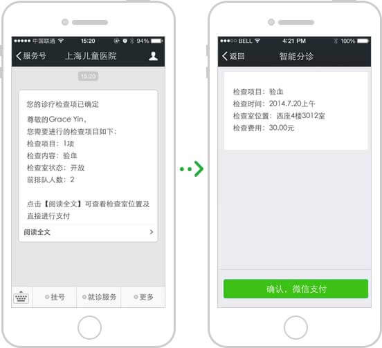 微信推送檢查單,點擊即可支付檢查費用;繳費成功后,微信導(dǎo)航到診室,刷診療卡即可