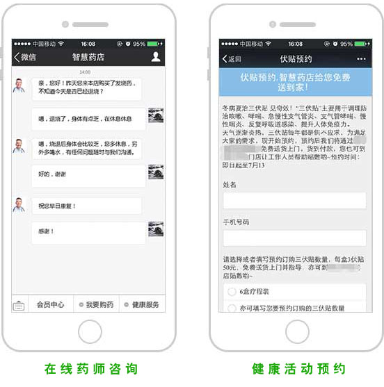 通過微信公眾號與用戶的連接,使得用戶在到藥店前,可通過在線藥師咨詢服務,了解病狀和適合藥品,在得到建議后,可到就近門店地址或網上進行購藥;另外,還可以結合藥店運營計劃進行健康活動的預約和宣傳,甚至可實現異業合作(如體檢、保險服務)