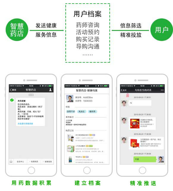 支付同時將用戶有效扭轉成微信粉絲,進一步發展成為藥店會員,并通過消費頻率,購藥記錄等大數據沉淀進行精準營銷