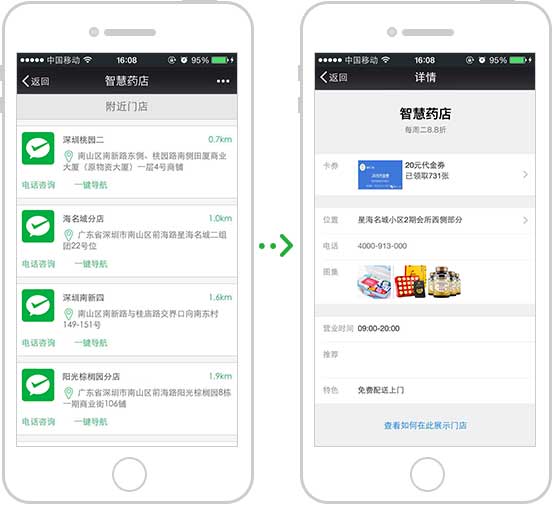 可用微信小店,亦可對接自有電商平臺,實現用戶低成本快速在線購買;附近門店導航。電商購買與實體店購買二不誤