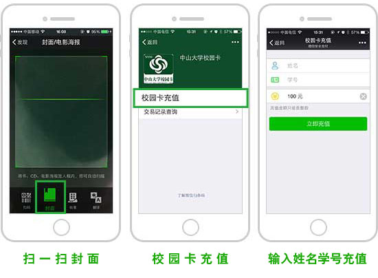 校園一卡通充值,通過微信掃一掃封面為固定入口,掃描校園卡,結合公眾號支付,隨時隨地給校園卡充值,再無需排隊等候