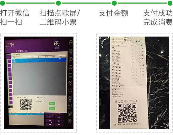 用戶在KTV通過掃描點歌屏的二維碼,或掃碼收銀小票的二維碼直接支付房費即可。服務員通過耳麥確認收銀成功即可完成包房的結賬
