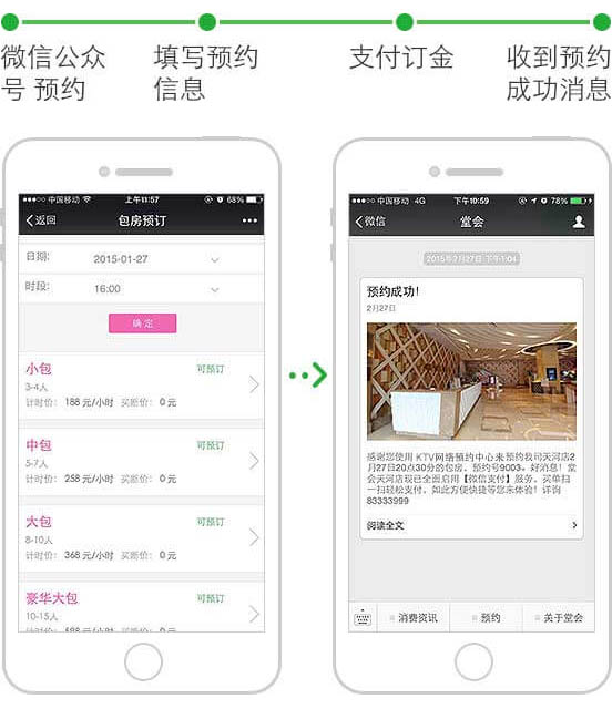 用戶可在微信直接預約KTV的包房并支付訂金,KTV通過微信可與用戶進行多種形式的信息溝通確認預約情況