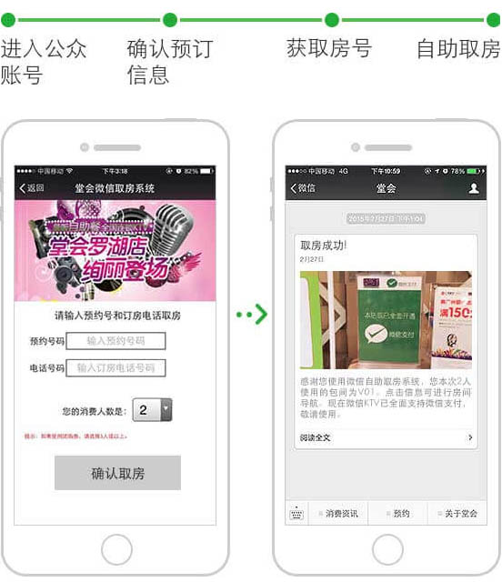 用戶通過公眾號進行預約成功后,到KTV現場可進行自助取房,免除消費高峰期排隊之苦,快速便捷