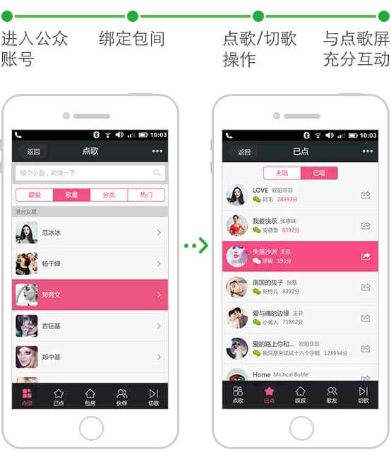 用戶通過微信公眾號與實際包房綁定后,即可進行微信點歌及歌曲編輯,與點歌屏充分互動