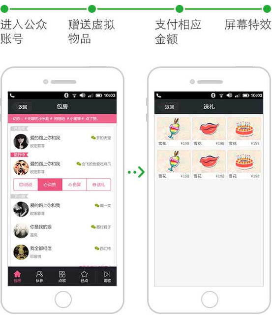 用戶可在包房內對好友進行虛擬物品的贈送。贈送的物品可以特效形式在K歌屏顯示,獲取禮品的用戶可進行兌換實物獎品