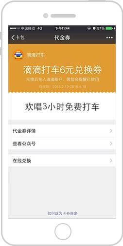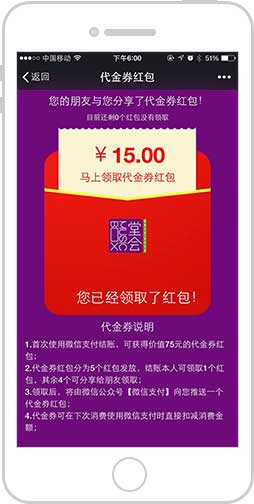 所有消費后的用戶可獲取代金券禮包,并可將代金券禮包分享出去,以此吸引更多用戶獲取代金券后到店消費。用戶獲取代金券后可存放在微信卡包