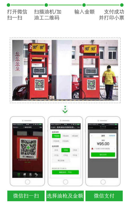 用戶在加油站通過(guò)掃描加油機(jī)的二維碼,輸入相應(yīng)油槍號(hào)即可準(zhǔn)確匹配油槍和油品價(jià)格,隨后輸入加油金額即可完成付款。加油員憑加油機(jī)旁邊懸掛的無(wú)線小票打印機(jī)打印的小票,確認(rèn)車輛放行