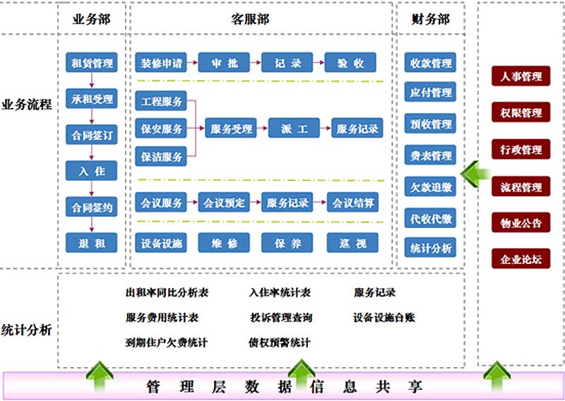 我們基于對物業管理行業發展趨勢的了解,在多年技術積累的基礎上,遵循集中管理、信息共享的原則,打造物業管理企業的信息平臺。