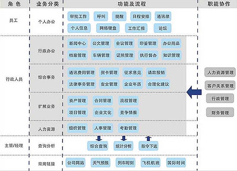 包括公共信息、新聞中心、公文管理、規(guī)章制度、會議管理、車輛管理、行政管理和費用申報管理。同時可拓展到人力資源管理內(nèi)容,如人員考勤、員工生日提醒、合同到期提醒、試用期到期提醒、退休提醒等。
